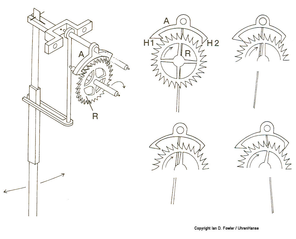 1. die Pouzait-Hemmung, erfunden um 1777 von dem Genfer Uhrmacher Jean Moise Pouzait, mit Hemmungsrad mit Stiften statt Zähnen und übergroßer Unruh, die eine Halbschwingung pro Sekunde macht;